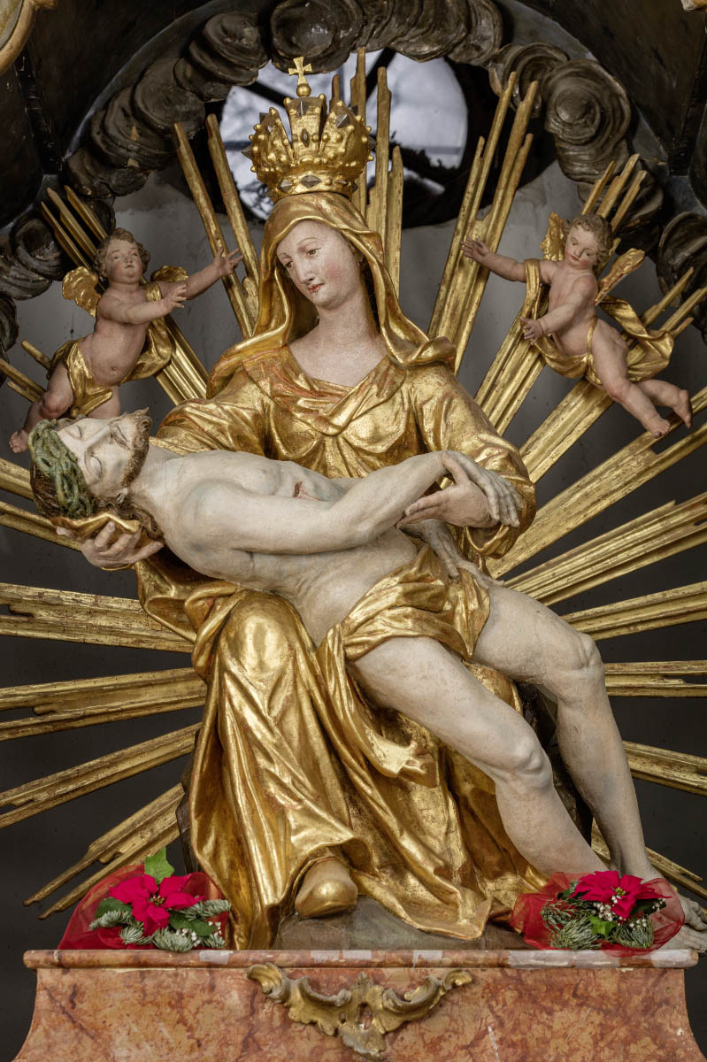 The altar is situated in the chancel, where it occupies the entire rear wall of the apse. There are side openings on both ends. The central niche of the altar architecture is open in order to enable light from the rear window opening to fall on the central figure of the Pietà.