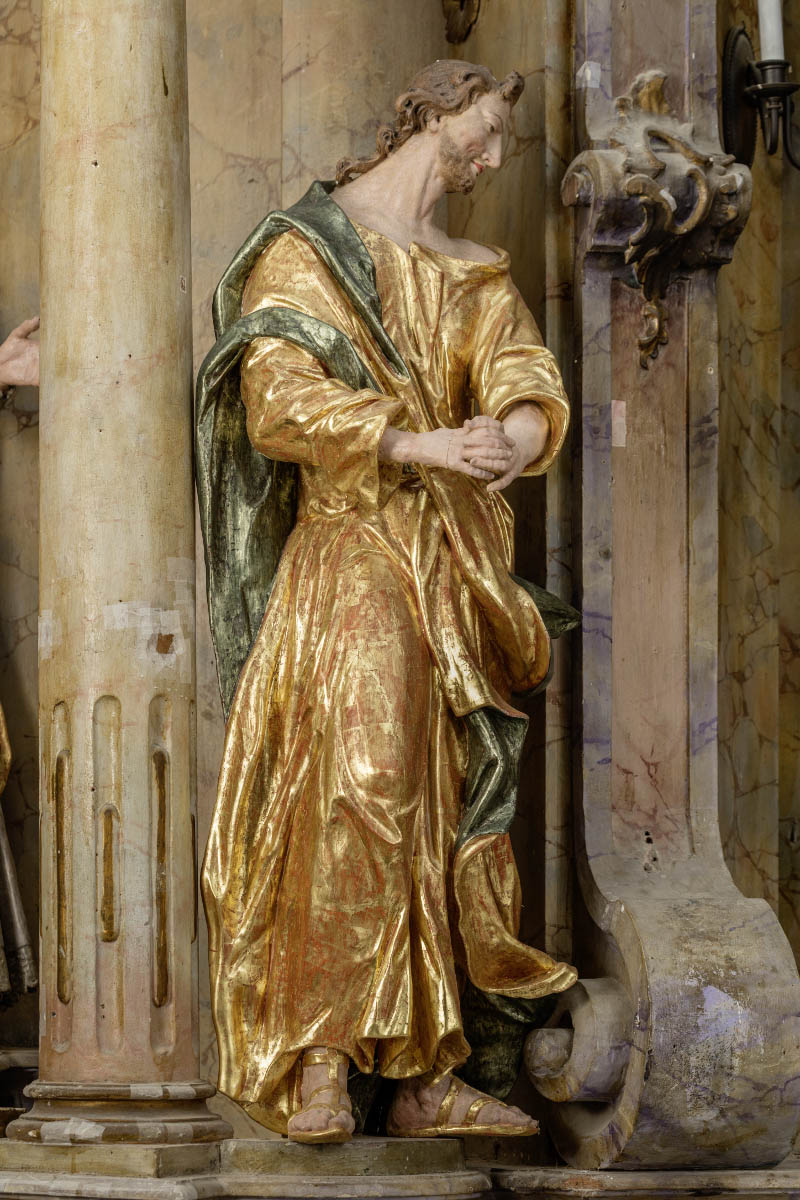 According to conservation documentation the altar was in part repolychromed once8 and in part at least twice.9 The gilding was partially repaired with metallic colours containing copper ("bronze"). The layer of repolychromy is visible on the retable and sculptures on the attic, whereas the five sculptures in the central part of the retable (Pietà, St Francis Xavier, St John the Evangelist, St Mary Magdalene, St Ignatius of Loyola) have been restored to their original polychromy from the 18th century.