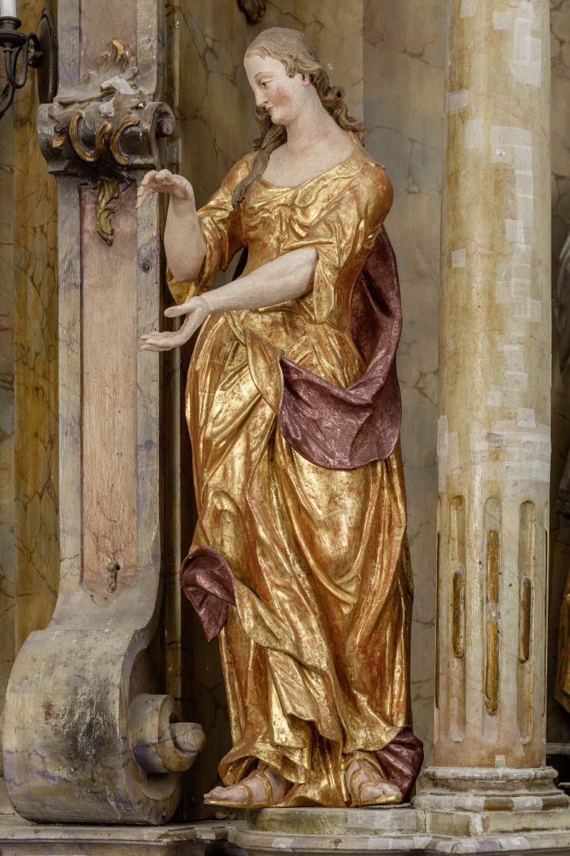 The high altar was first mentioned in the text of the canonical visitation in 1771,1 which stated that it had been commissioned by the local community and the local patron Ignacije Kašnar, of whom contemporaries had a very low opinion.2 The parish priest Švagel wrote in 1788 that he had paid the debt "of 20 forints to some painter for painting the high altar".3 The sculptures were attributed to Franz Anton Straub by Doris Baričević on the basis of style resemblance to the work of his brothers.4 Nevertheless, unlike ornamental decoration on other altars attributed to Franz Anton Straub, the subtle ornaments with perforated core and curly attenuate edges are shaped in a way more similar to, for example, that of the high altar in Tugonica, where the sculptures were created by another artist.5 Restoration works revealed the date 1764 written on predella behind the tabernacle, thus correcting the date 1768 mentioned in previous literature. 6 According to the similarity in the concept and execution of marblings to those on the high altar in Tugonica, Podgorje Bistričko and Vinski Vrh, the polychromy might be by the painter Jacob Reißer.7