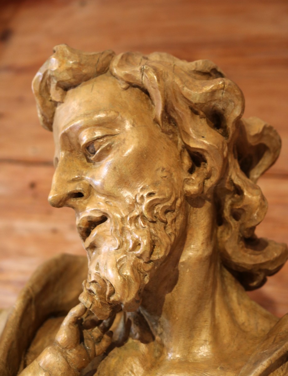 The statue of St Joseph with the infant Jesus was purchased by the city museum of Göppingen in the 1970s from art dealer A. Mehringer, Munich;1 since then it has been part of the permanent exhibition of the museum (Göppingen, Museum im Storchen, Inv. 71/19). The sculpture made its first appearance on the art market in Munich in the exhibition of the auction house Rudolf Neumeister in Munich in 1966, where it was attributed to an unknown master from the Middle Rhine region.2 Only some time later was the attribution to Philipp Jakob Straub proposed due to stylistic resemblance to the work of the latter. Dating ranges from around 1750 to 1755/60, Horst Schweigert suggested that the artist created the sculpture during his mature period after his work in Ehrenhausen.3 The fact is, that most comparable works by Philipp Jakob Straub such as in Ehrenhausen (ca. 1752–1760) or in Maria Lebing, Hartberg (1747–1749) are only attributed to him, with no archival evidence to strengthen the argumentation. But there is indeed a strong "family resemblance" to the works of Philipp Jakob and also of Joseph, e.g. St Joseph in Štanjel (Slovenia).4 Joseph's St John the Baptist in the Maribor Regional Museum is also quite close in some details but much more expressive. A wooden bozzetto (fig. 5) has been connected with the sculpture of St Joseph in Göppingen too.5 But it differs in some important details, most prominent is the divergent function of the left arm. While the arm of Joseph in the bozzetto was meant to hold some attribute, in Göppingen the arm and hand are raised in an expressive gesture.