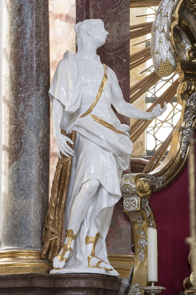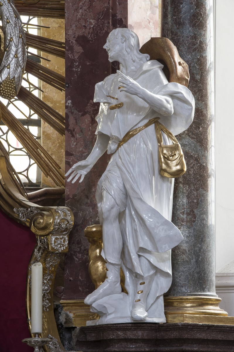 In the list of J. C. Lippert the five sculptures are registered under the numbers 50 and 51.1 St Agatha, St Florian, St Rochus, St Sebastian and a bust of St Benedict, are part of the 2 sidealtars dedicated St Benedict and St Quirinus. Two small sculptures representing St Cosmas and St Damian standing in two niches of the predella of the altar dedicated St Benedict are not attributed to any sculptor. Both altars were erected in 1748 in marble combined with stucco. The architecture is partially decorated with metal ornaments in silver and gold. The tabernacles are made in gilded copper. The stucco on the altar and the reliefs on the walls and the ceiling were made by Johann Georg Üblher (1703–1763).2 Concerning the date of origin of the sculptures, Norbert Lieb supposes a connection with the 1000 years anniversary of the monastery on 7 July 1753.3 Roland Götz says that the anniversary was held in 1746.4