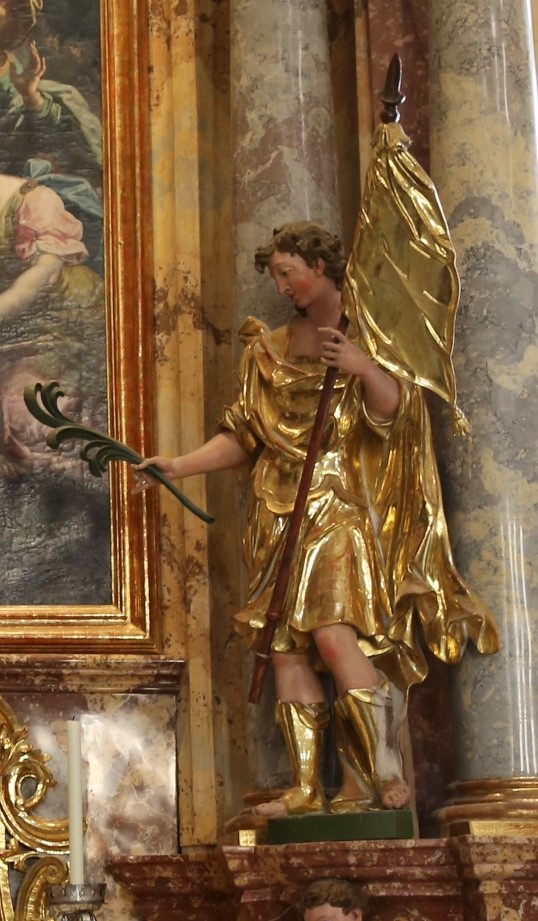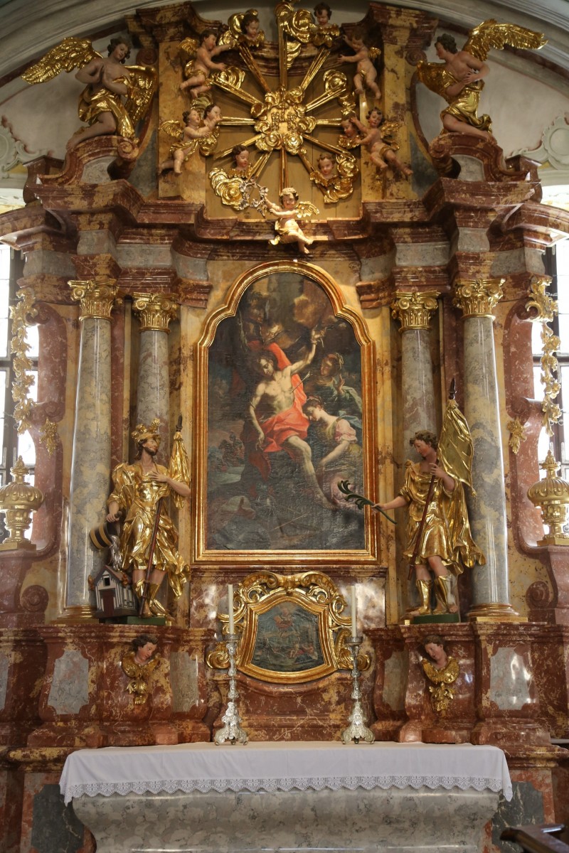 The Sebastian altar was gilded in 1762 by Franziskus Reich (as all the other altars within the church, except the Narcissus altar).2