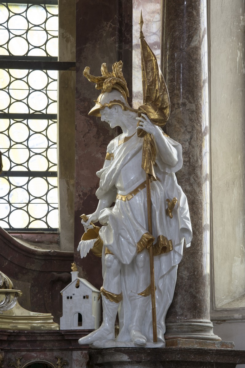 In the list of J. C. Lippert the 5 sculptures are registered under number 50 and 51.1 S. Agatha, St Florian, St Rochus, St Sebastian and a bust of St Benedict are part of the 2 sidealtars dedicated St Benedict and St Quirinus. The center of the altar dedicated St Benedict is the bust of St Benedict. Two small sculptures representing St Placidus and St Maurus are presented in two niches of the predella behind glass of the altar dedicated St Benedikt. They are not attributed to an sculpturor. The sculptures representing St Agathe and St Florian belong also to this altar. Both altars were erected in 1748 by marble combined with stucco. The architecture is partially decorated with metal ornaments in silver and gold. The tabernacles are made by gilded copper. The stucco of the altar and the reliefs at the walls and the ceiling were made by M. J. G. Üblher (1703–1763).2 Concerning the date of origin of the sculptures N. Lieb supposes a connection with the 1000 years anniversary of the monastery in 07. 7. 1753.3 R. Götz says that the anniversary was held in 1746.4