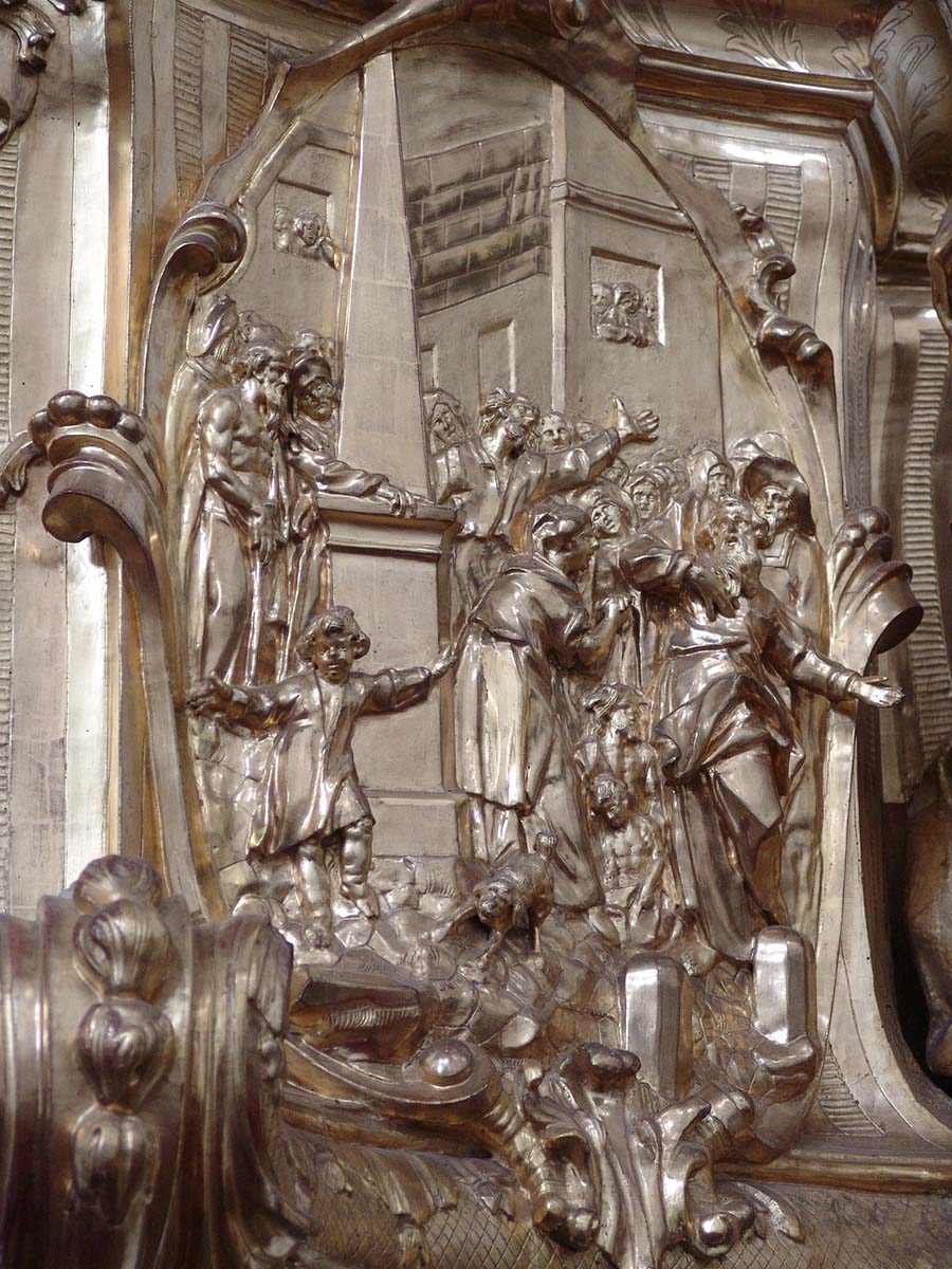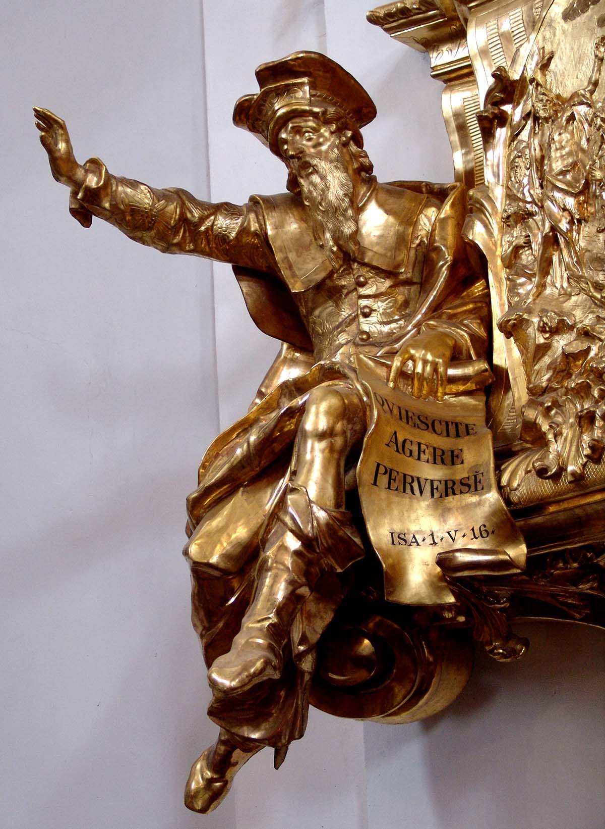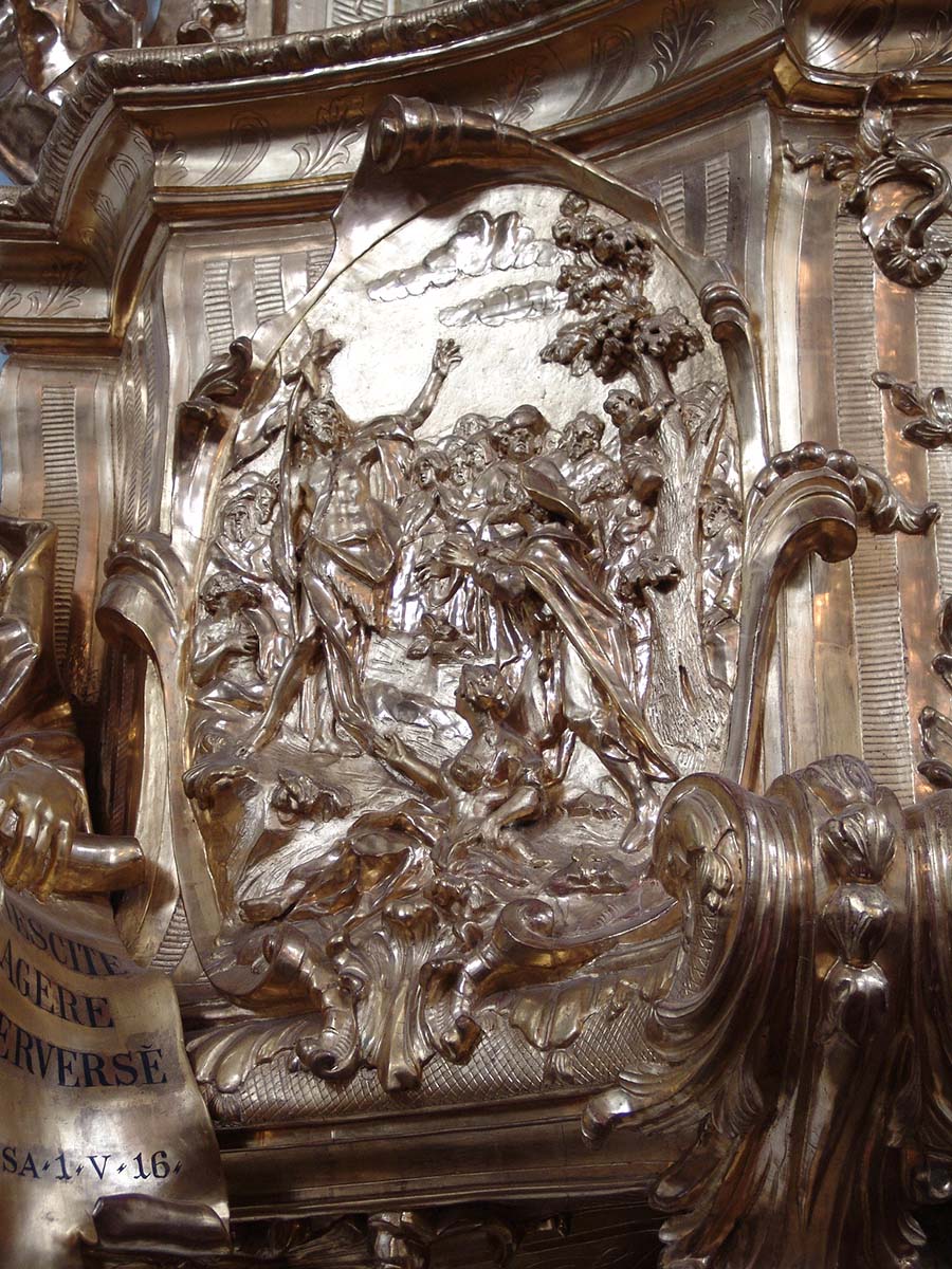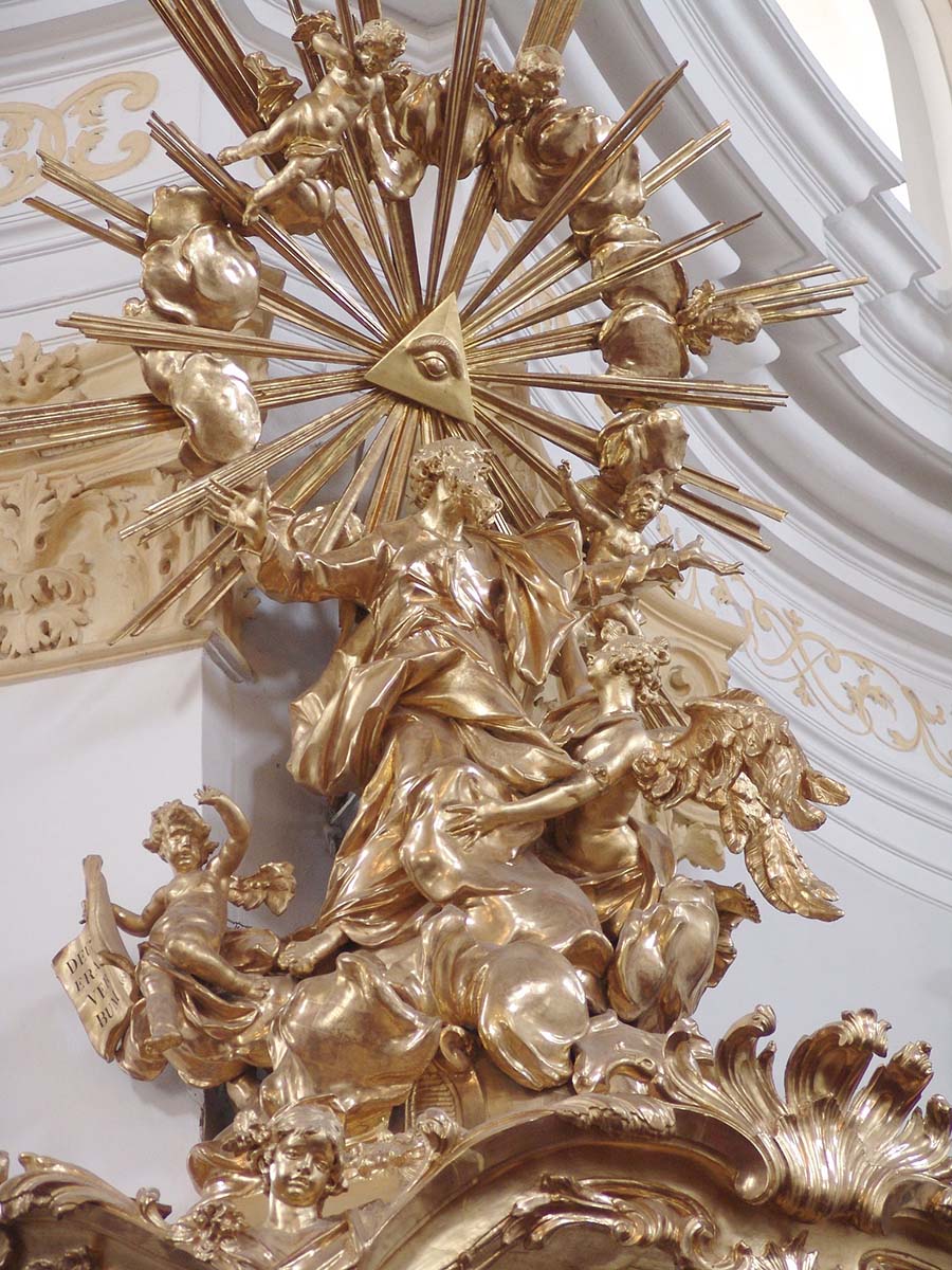 The completely gilded pulpit with its figural decoration of outstanding quality and its rich rocaille elements may be called a pivotal example of Munich Rococo; it has no equivalent within Austrian sculpture of the 1730s.5 Sitting on the outside of the basket are two nearly life-size figures: on the left side Isaiah, on the right side Jeremiah. Between the two prophets are two reliefs, depicting the sermon of St John the Baptist (left) and the sermon of St Paul on the Areopagus (right), in the centre is a figural group of two putti holding a model of the church .6 On the left side of the rear panel of the pulpit, the Angel of the Last Judgement shows his sword. Underneath the canopy, is a dove representing the Holy Spirit, on top of the pulpit the artist sculpted the Apotheosis of St. John the Evangelist, a highly agitated pyramid of clouds with the saint topped by the Holy Trinity.