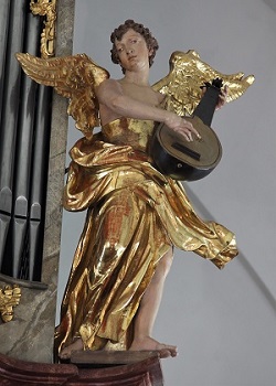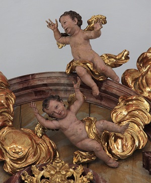 According to documentary entrance, the sculptures of the organ were made in 1765 by Philipp Jakob Straub.1 They appear very vivacious and dynamic and represent the heavenly music. They are arranged according to the triangular composition: In the lower area, there are two standing angels with a harp and a lute flanking the organ. Above, there are two putti with a hymnbook and cymbals and two sitting angels with a trumpet and timpani. Next higher we see a putto with a two-part elongated instrument and one with a violin, followed by the last two musicians, a putto with a clarinet and one with a flute. On top, there a two putti apparently falling downwards. It is evident, that the sculptures on the organ show significant differences in their quality.