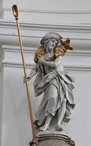 The castle and the parish church of Hollenegg belong to the property of prince of Liechtenstein and date back to the 12th century, whereby the church has been rebuilt in 1750 by Marburg builder Johann Fuchs.1 The oval, bright main room with four niches shows a high quality rococo interior. The pulpit is located on the pilaster on the eastern wall between two of the niches. On the sounding board stands the sculpture of the Good Shepherd, as white-coloured as the sculptures on the high altar. The body appears twisted and highly dynamic which makes it comparable not only to the angels on the high altar, but especially to the four angels of Ehrenhausen, which hold the Instruments of the Passion and which are highly impetuous. They typify the artist’s sculptural climax.2 The sculpture’s white colour may imitate marble.