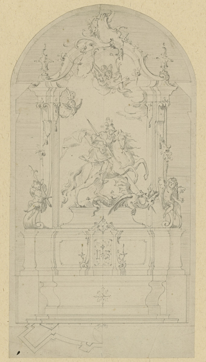 St George's was built in 1751/52 by the architect Johann Michael Fischer. Fischer was hired by the Benediktbeuern Monastery which is situated a short distance from Bichl. Straub was payed 300fl for the altar in 1752.1 1The painter and gilder Joseph Geiger received 180fl to paint the altar. Lippert documents the altar under no. 59.2 A drawing of the altar exists in Artbibliary of State Museums in Berlin (Kunstbibliothek, Staatliche Museen zu Berlin), HdZ 6847, and in Salzburg (Landesmuseum, see database no. 3186). The drawing also shows one half of the horizontal projection. The altar is attached to the church wall. The three-dimensional and very vivid sculpture of the mounted St George fighting against the fire-spitting dragon, which is lying between the horse's legs, is the fascinating centerpiece of the altar. The architecture and the background with a painted landscape on wooden boards form a decorative setting.