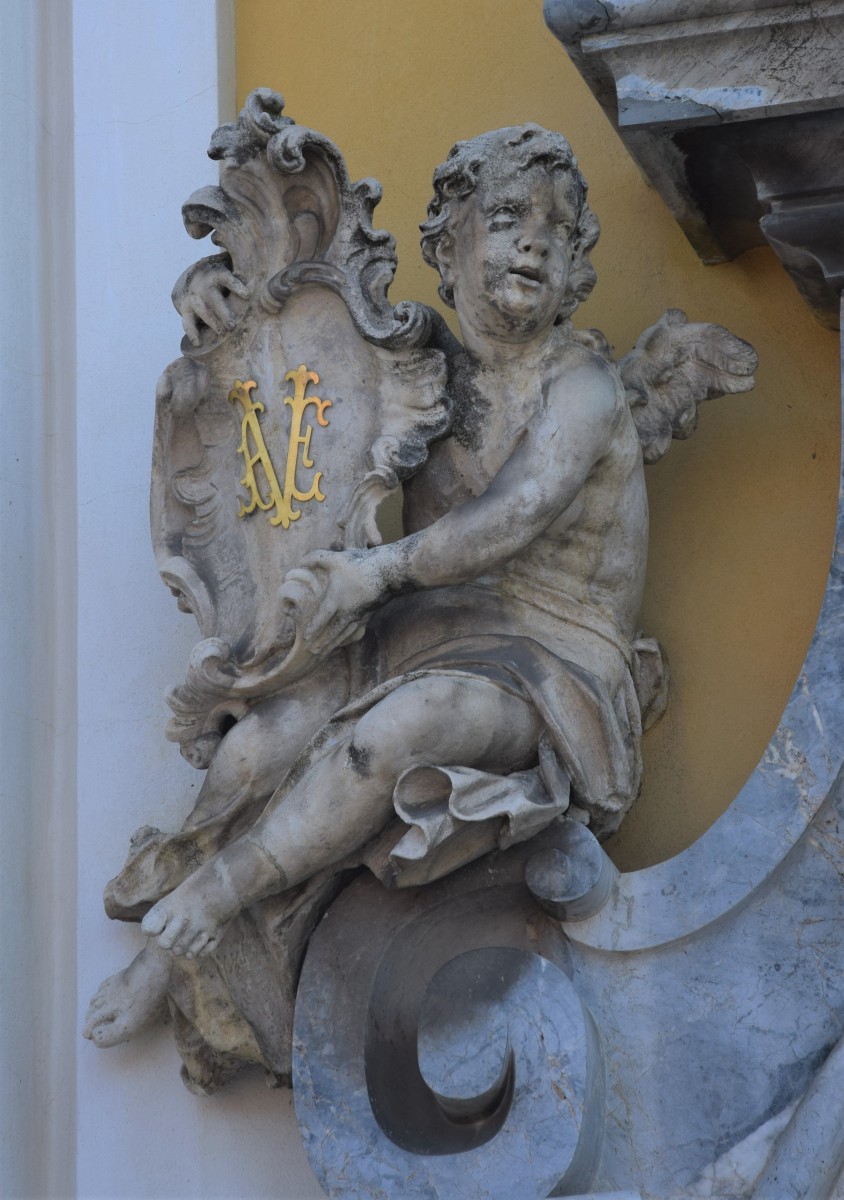 - Putto with cartouche (left), portal Basilica Mariatrost, Graz (photo by Christina Pichler, 2018)