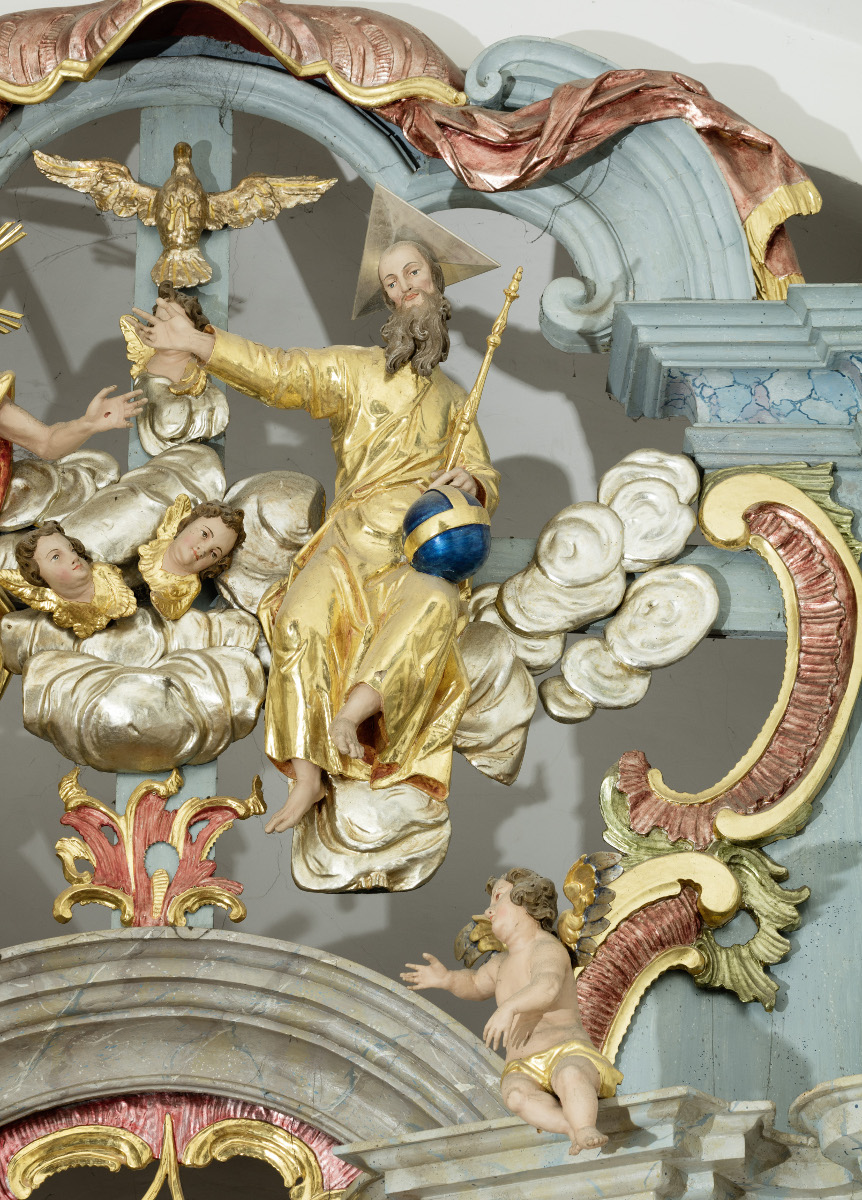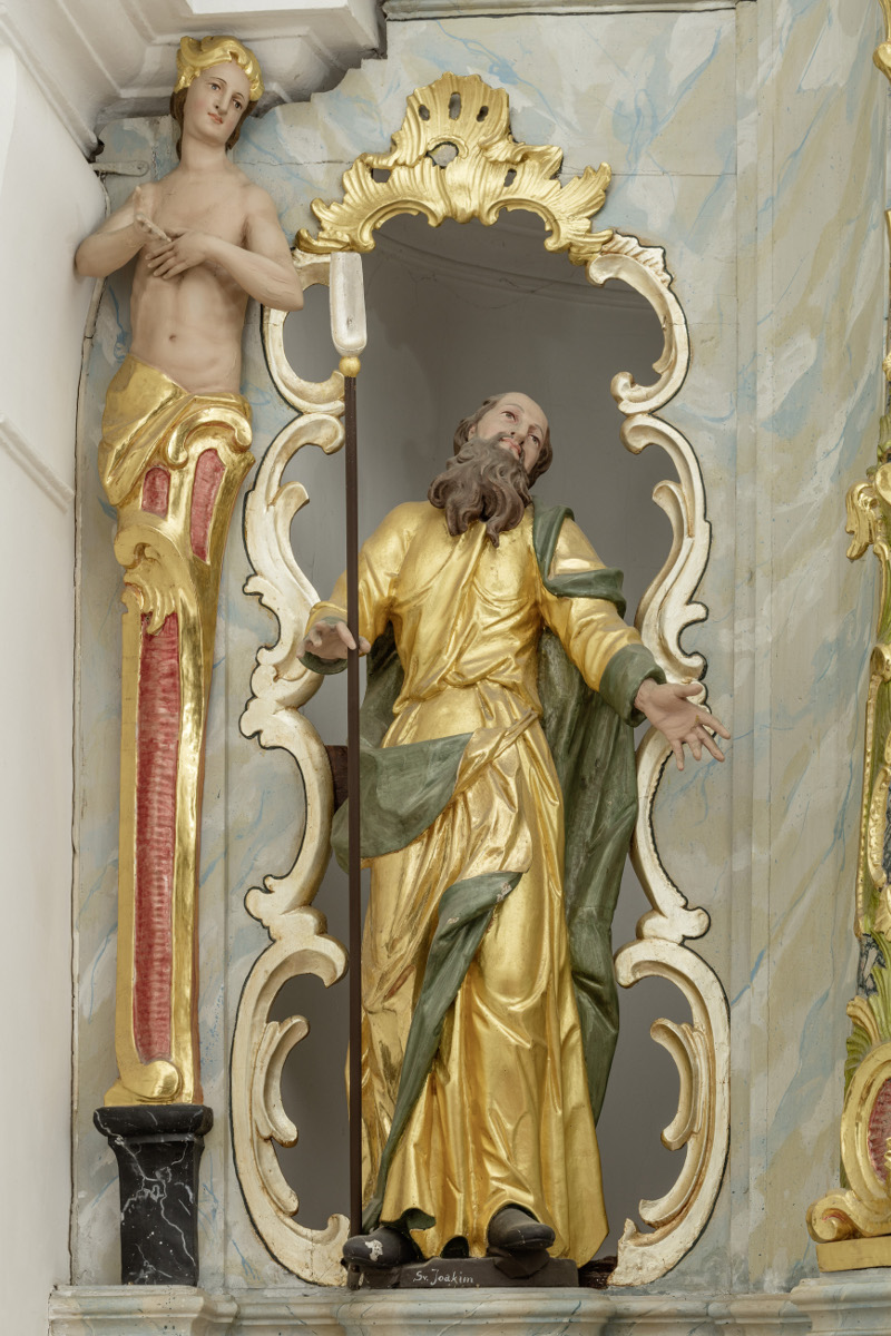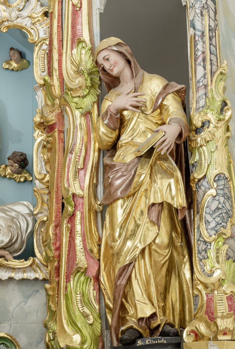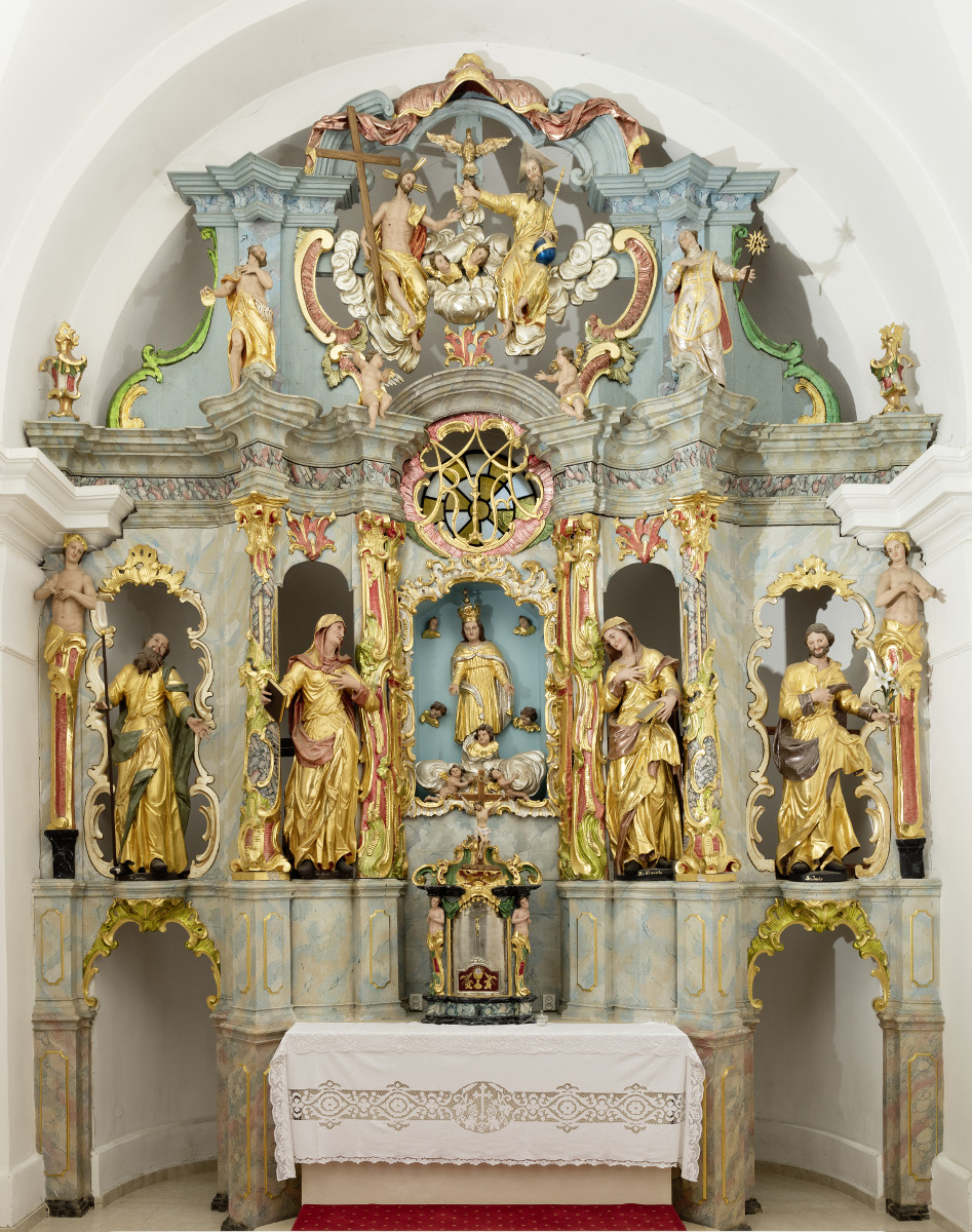 The high altar is situated in the chancel where it occupies an entire rear wall of the apse. The altar architecture itself echoes a somewhat conservative design, but it is transformed in such a way that it demonstrates prominent non-architectural characteristics. The shafts of the columns have "disappeared" under rocaille shapes and have been converted to gigantic ornamental formations or even anthropomorphised by being carved into hermae.5 The intercolumns are opened and framed with lavish rocaille shells, volutes, scrolls and similar forms. Above the central small figure of the Virgin Mary, which dates from the previous high altar, there is an opening with Maria's monogram. Large sculptures of Saint Joachim, Saint Anna, Saint Elizabeth and Saint Joseph stand in intercolumns. On the attic the central sculptures of Holy Trinity are accompanied by Saint John the Baptist and Saint Ignatius de Loyola.